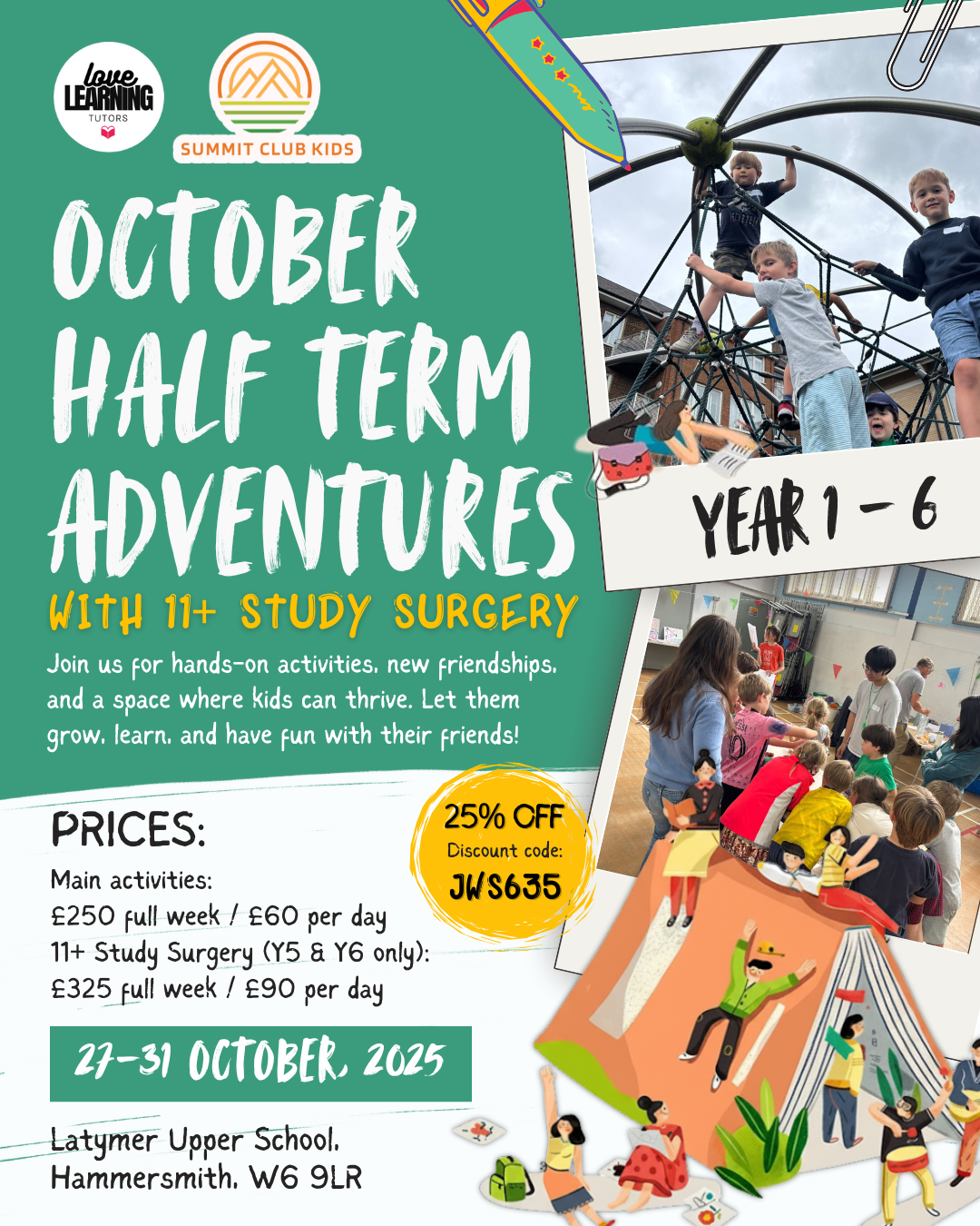In addition to the Summit Kids Club activities, children will take part in a daily 11+ Study Surgery for Years 5 & 6 delivered by the expert team at Love Learning Tutors. These sessions replace one activity in the morning and one in the afternoon, providing two hours of calm, structured exam prep each day.